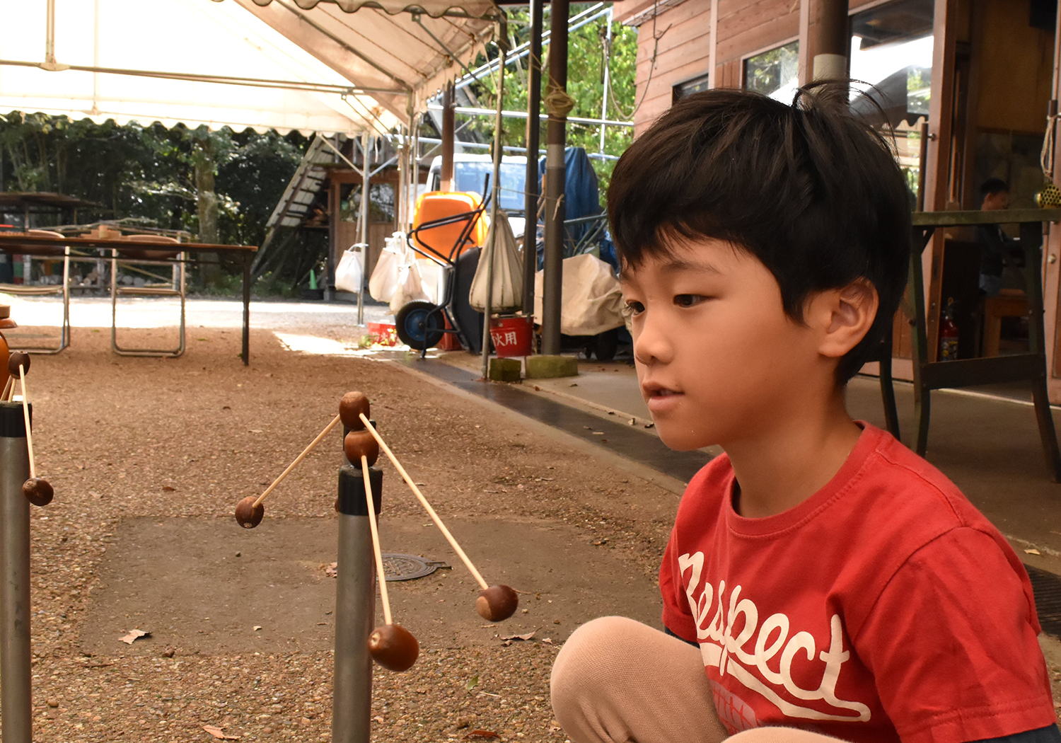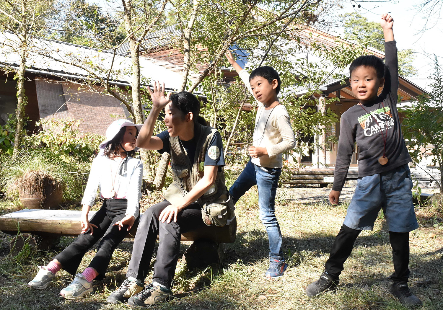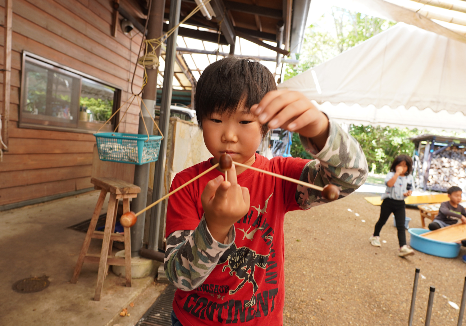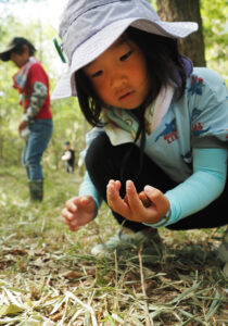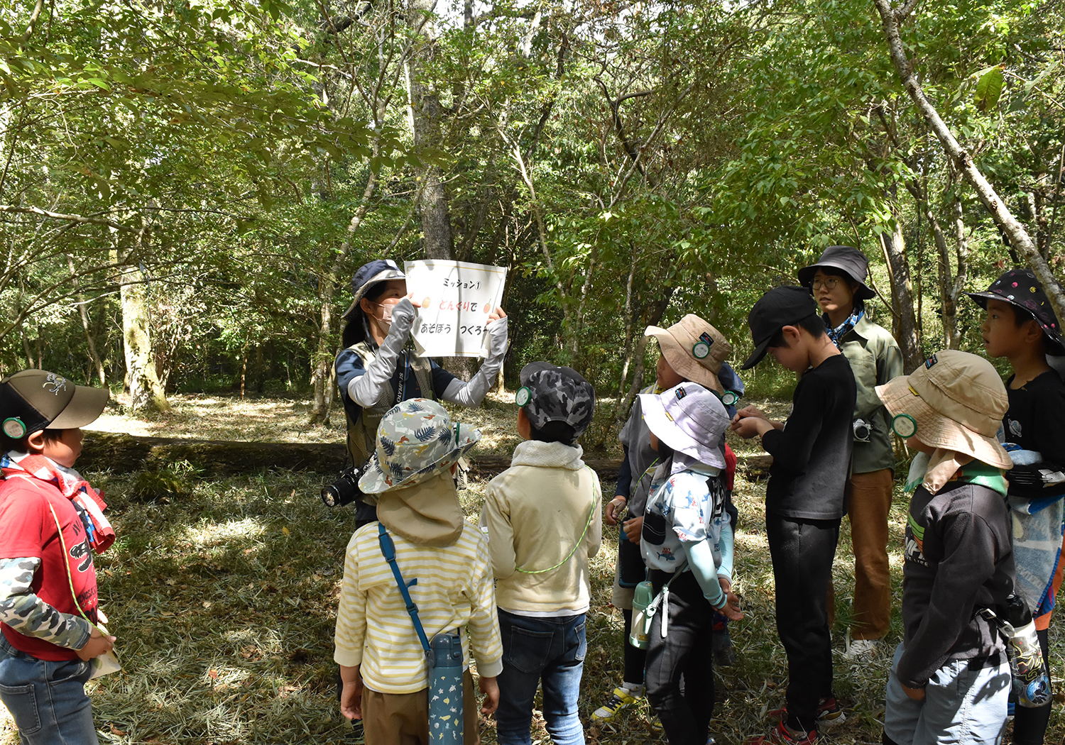 ▼森の中で今日のミッション①「どんぐりでつくろう あそぼう」が発表されてみんな歓声を上げてくれました。