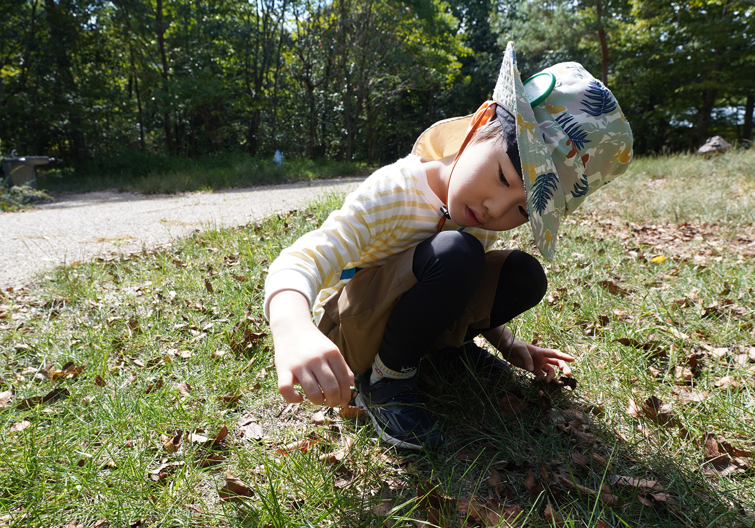 午前は森たんけんとどんぐり拾い。ミッション①は「どんぐりでつくろう あそぼう」、