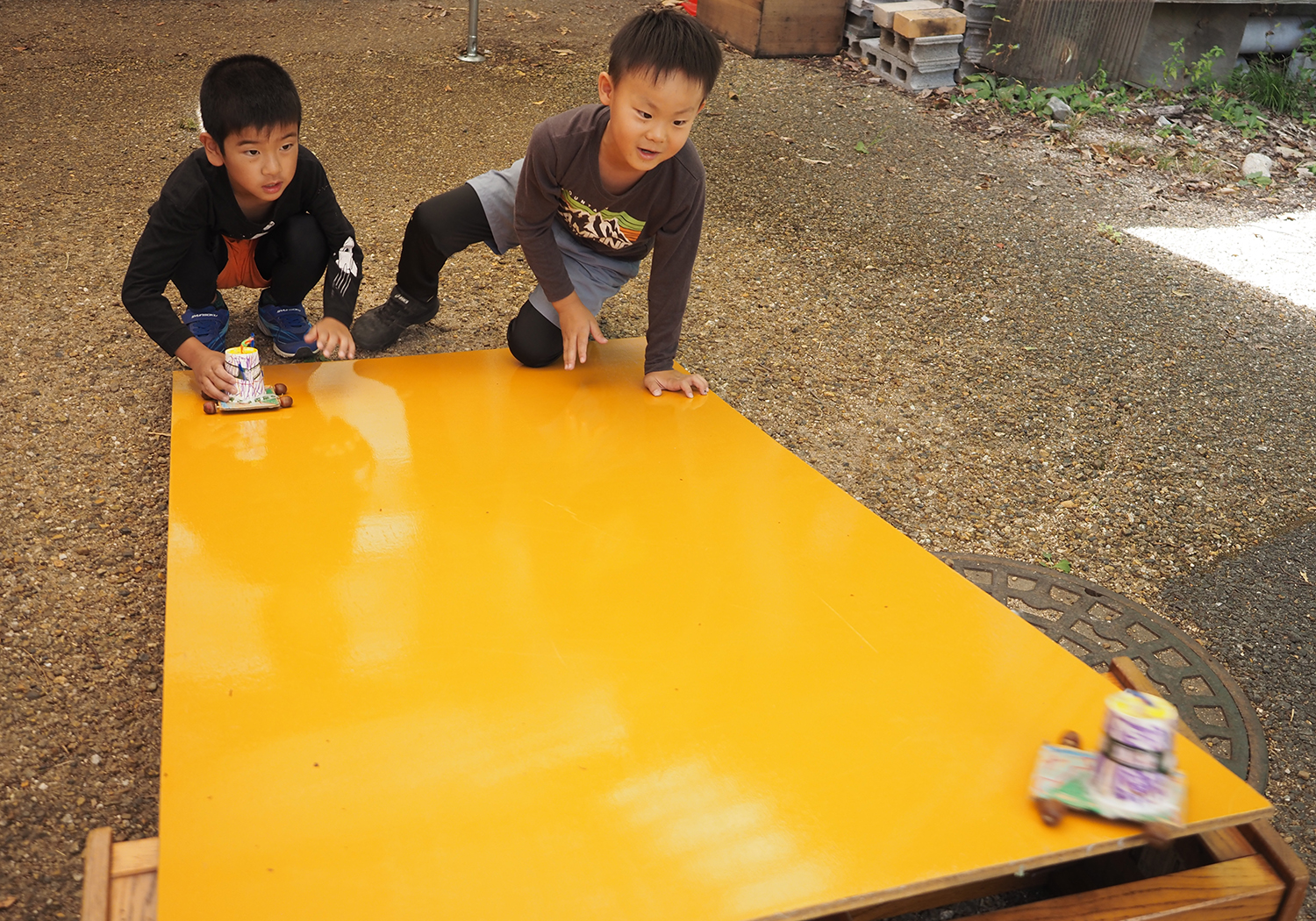 ▼どんぐりをタイヤにしたどんぐりカー。みんなオリジナリティある作品を作っていました。