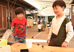 ▼出来上がったつるりんに紐を通してペンダントに。リズムに乗せて紐を結ぶのですが、隊長のお手本よりみんな上手!
