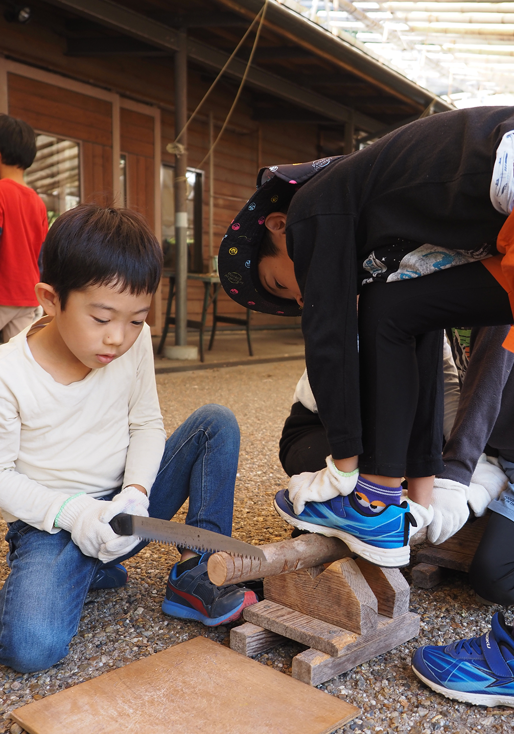 ▼ギーコギーコ。思ったより木は固かったけど、みんな頑張ってつるりんの材料になる枝を切りました。