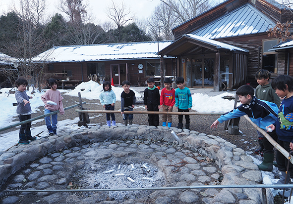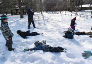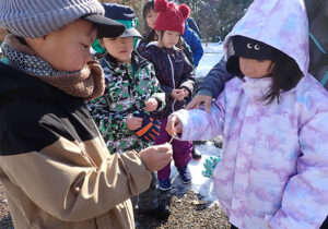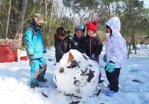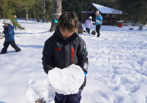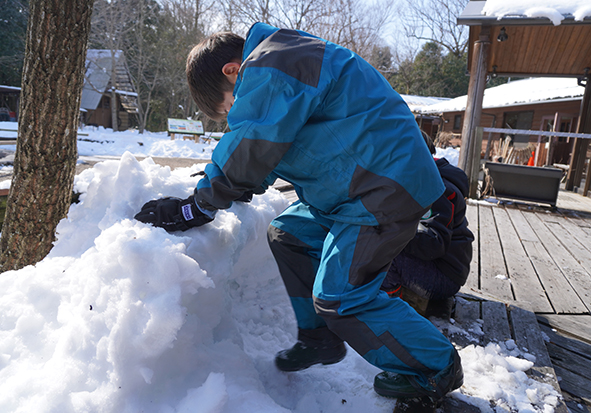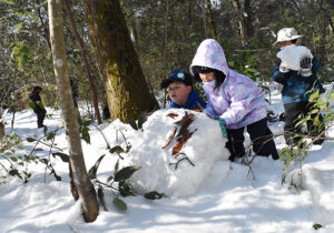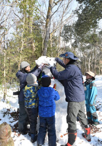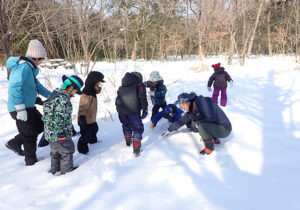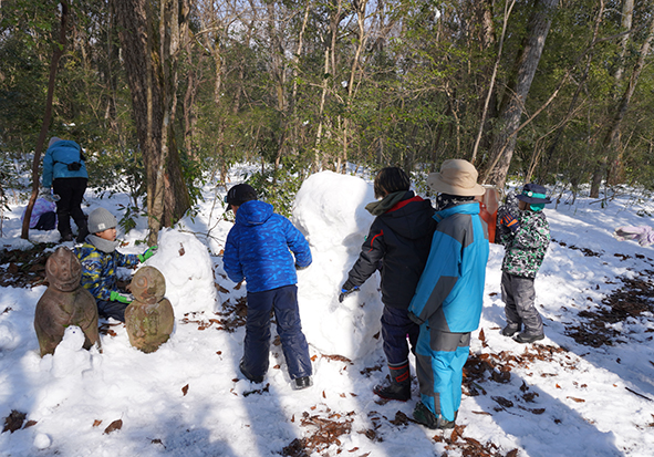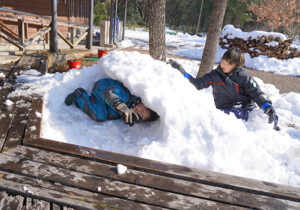▼約1時間半の雪の森たんけんが終わった後はお昼ご飯にしました。お昼ご飯を食べてからもまだまだ雪遊びしたい子どもたち。今度はたまった雪でかまくら作りを楽しんでいました♪