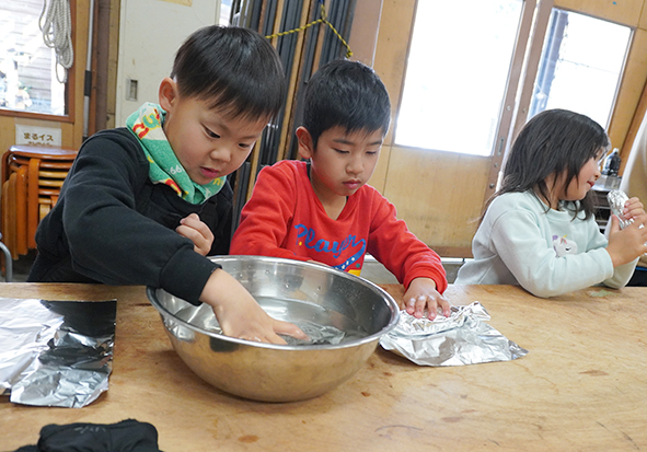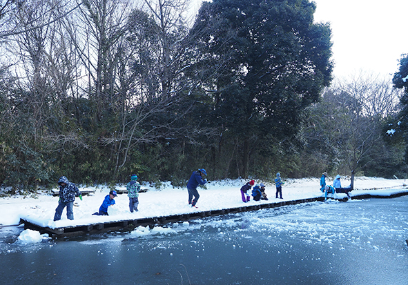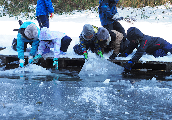 ▼氷の上に雪玉を投げて雪が割れるか挑戦したり。みんなで力を合わせて、窓ガラスみたいな大きな氷を引きあげました。