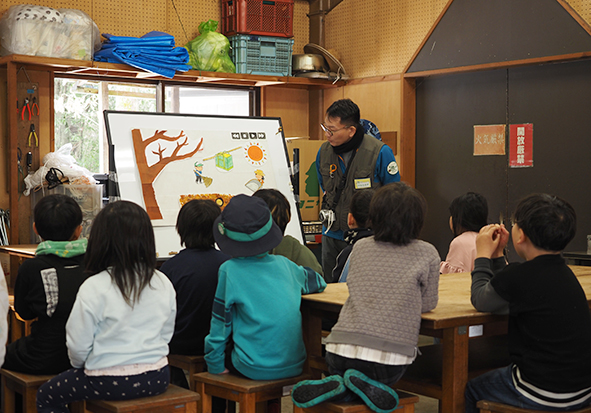 ▼その後は今日のミッション②「たねこちゃんをまもろう!」でした。たねこちゃんを守るためには森の落ち葉をかき、下草に光を当てることが必要です。パネルシアターで、たねこちゃんを守る方法を教えてもらいました。