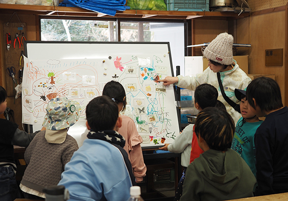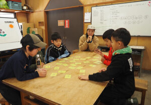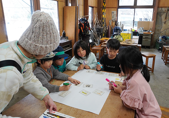 ▼本当はこの後、森の落ち葉かきにいきたかったのですが、この雪では落ち葉も見えません。今回は諦めて、もう少し深くいきもののつながりを学ぶことにしました。まずは、隊長お手製のいきものカードで神経衰弱。誰が勝ったではなく、チームみんなで全部当てられたら合格です。「ウサギここやで!」「キノコあっちやで!」と協力する声が聞こえていました。
