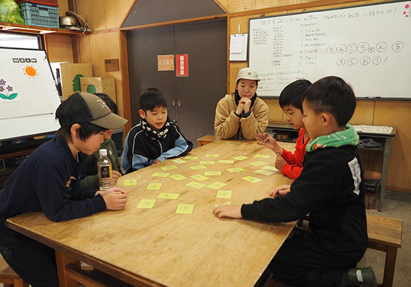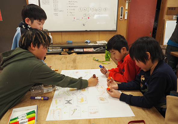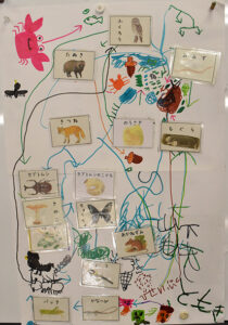 ▼神経衰弱ゲームが終わったら同じいきものカードを使って、いきものたちの「食べる・食べられる」がどのようにつながっているのかを考えてみました。