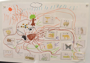 ▼いきものをつないでいくと、カードにないものもたくさん出てきました。サワガニ、魚、どんぐり、ダンゴムシ、微生物、いのちを終えるいきものたち、土、空気、太陽。そういうものをどんどん書き込んでつないでいくと、いきものたちは「全部つながっている、いのちは続いていくんだ」ということが見えてきました。