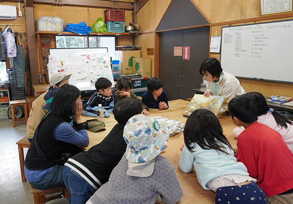 ▼最後にいのちのつながりを描かれた絵本「のにっき・近藤薫美子著(アリス館)」をみんなで読みました。終わった後に「自然のリサイクルやな!」と言ってくれた子がいました。みんなが楽しいと思ってくれている森はいのちがぐるぐる循環していると自分たちで気づいてくれたことが嬉しかったです。