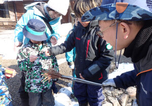 ▼雪の中で見つけてくれたのは、ウサギのフン。「この辺で草を食べていたのかなぁ。」「でも、近くに足跡がないね~」と観察しました。
