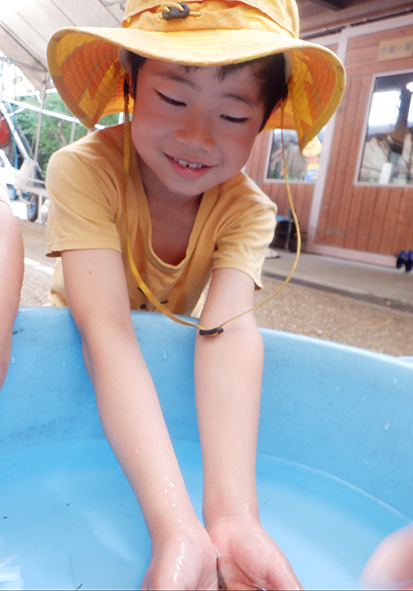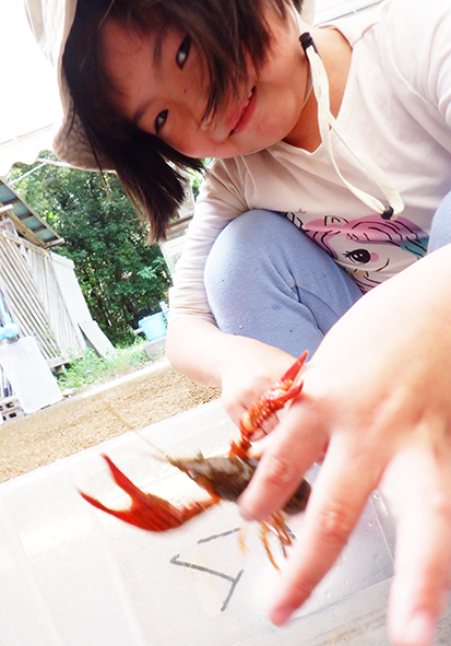 いきものはサワガニ、ドンコ、ザリガニです。触るいきものによって、表情が異なるように感じました。