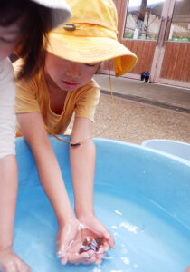 川に入ってのガサガサいきものつかみはどうでしたか?全身びっちょんこになっていきものをつかまえましたね。網にいきものが入った時の喜び、魚が跳ねる感覚をずっと覚えててもらえたら嬉しいなと思います。