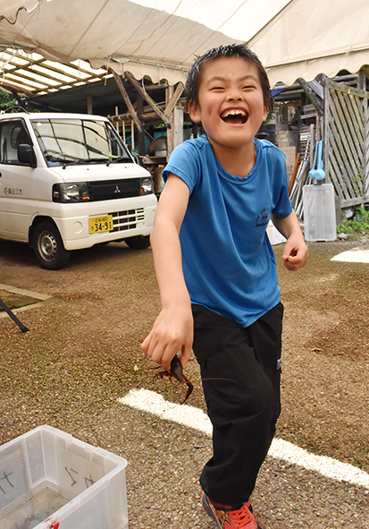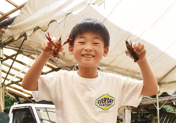 ▼両手にザリガニ持つと、こんな顔になっちゃうんだね。
