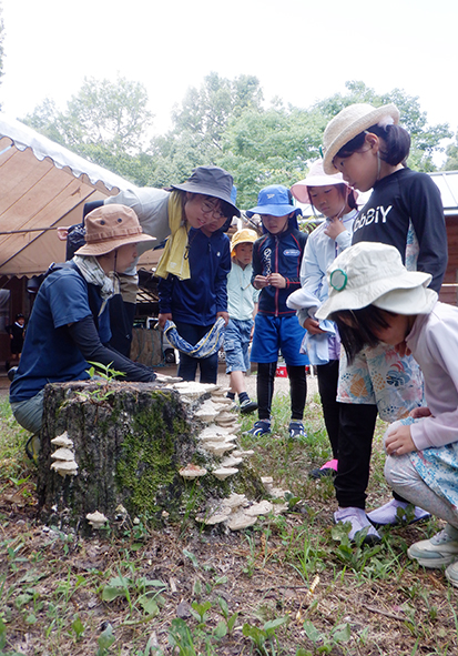 ▼切り株にびっしり生えているキノコを隊員の一人が発見。みんなでみました。
