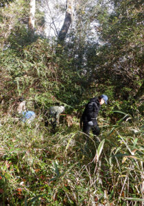 ▼②のイチリンソウ付近の整備です。イチリンソウ自生地までの場所がササで生い茂っていたので、丁寧にササ刈りをしてくださいました。山地性のイヌガヤも自生していますが、枯れ枝を伐って樹形を整えてくださいました。