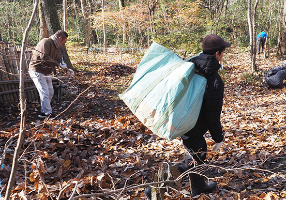 ▼落ち葉でいっぱいのグリーンバックを軽々と運ぶ。