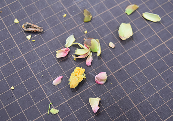 ▼ヤブツバキのつぼみがどう重なっているのか知りたくて分解してみました。つぼみの中にこれだけ入っていたのですね。