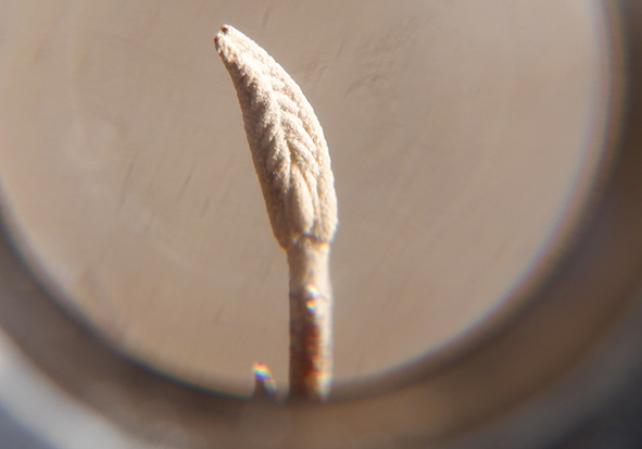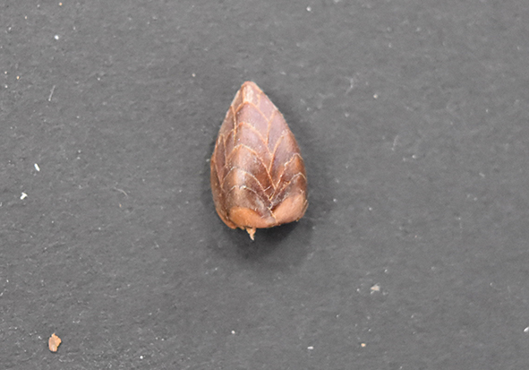 ▼これは、ナラガシワの木の芽です。ゴツゴツした木の芽を開けると、(ちょっと見にくいですが…)中には何枚かの葉とふわふわの毛がたくさん生えていました。見られた方からは「葉や木になるものがギューっと小さく入っているんだなと思いました」「毛がたくさんあってあったかそう!」という感想をいただきました。