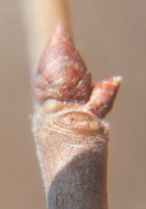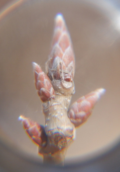 ▼小さな冬芽はルーペでみるとこんな感じです。木の芽の下の葉っぱのとれたところ(葉痕・ようこん)が顔に見えてきませんか?そう思うと木の枝に小人の姿が見えてくるのが冬芽観察の面白いところ♪小さな世界がひろがりますね!