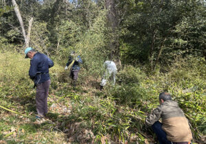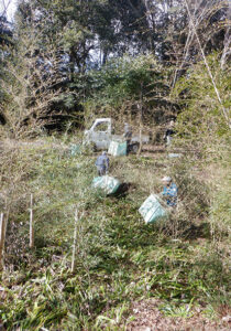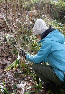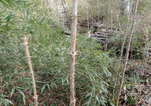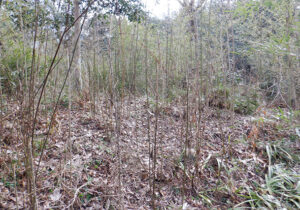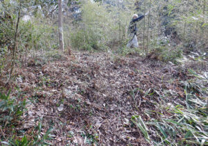 ▼現場に到着。この場所の竹は2023年に花が咲いたため稈(幹)枯れました。その一部を除き全部伐りました。その後に生えてきたパイオニアプランツが増えてきたので地際で刈りました。