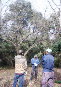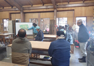 ▼今日の作業内容と場所の確認から。枯れた竹林を整備します。ある参加者が「今日は(人数少なくて)さみしいなぁ」とポツリ。少数精鋭で今日もレッツ保全(^^)/