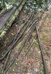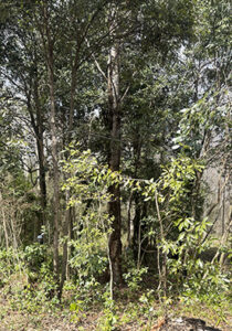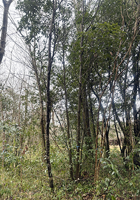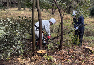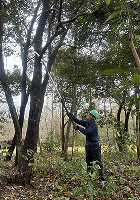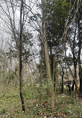 ▼このエリアは、手を加えていなかった場所でもあるため、木々が重なり合って生えています。光があたらない枝は、枯枝となっています。高枝切りノコギリで枯枝の伐採も行いました。