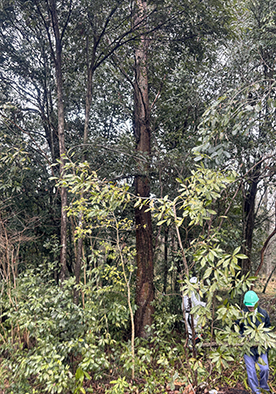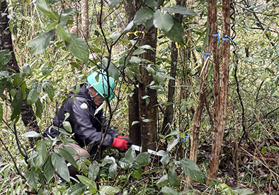 この森には2020年に花が咲き枯れて放置している竹林、2023年に花が咲き枯れ、枯れた竹を伐採した竹林、枯れた竹を残した竹林、いまだに開花していない竹林と、同じハチクですが、さまざまな環境の竹林があります。それらの場所でどんな違いが見られるかを、様々な方法で調べ、開花し枯れてしまった竹林がどのように変わっていくのかを研究されています。