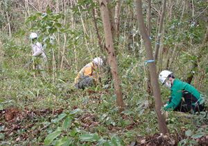 ▼林冠がすっきりしたと思ったら、明るくなった林床には、常緑樹の実生やササがたくさん。こちらも丁寧に刈りとりました。