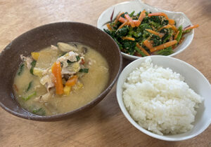 ▼お腹もすいたところで、本日のお昼ご飯は、地元の方に頂いたお野菜が入った、粕汁とほうれん草のお浸し、ご飯です。今日も美味しいご飯、ごちそうさまでした!