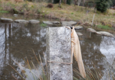 ▼そんなみんなのがんばりを、クビキリギスさんが見守っています。