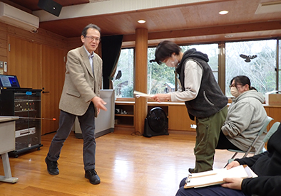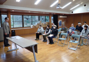 作業が終わった後、ここ数年の恒例になってきましたが、滋賀県立大学環境科学部環境生態学科の学生さんによる、卒論発表会を開いていただきました。2023年から、河辺の森の枯死した竹林を中心に籠谷先生、荒木先生の研究室の学生さんが研究をしてくださっています。