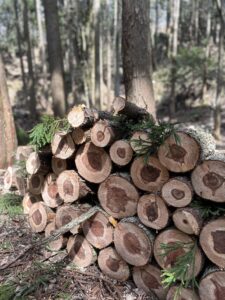 布引の森では、丸太椅子にしたり、薪として活用します。