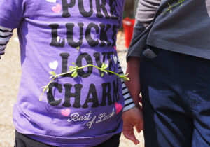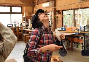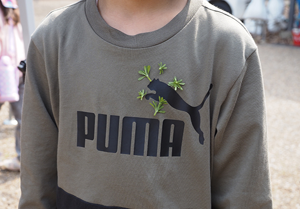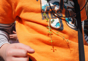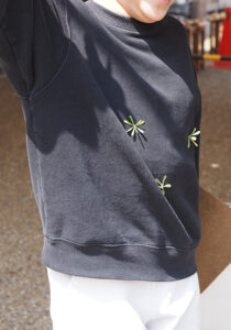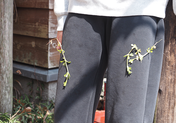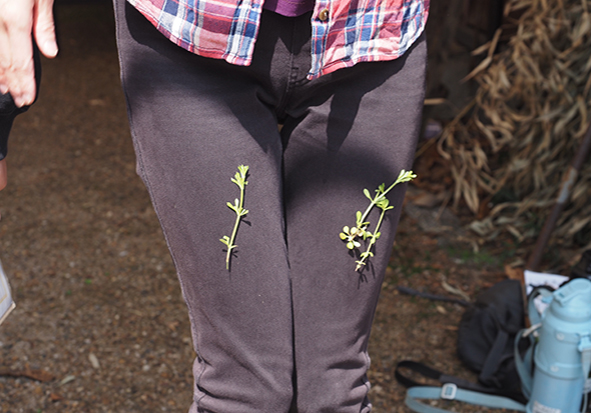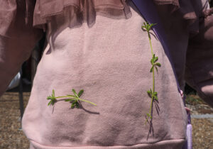 ▼ヤエムグラという草を服に貼り付けて装飾。パリコレならぬ「ハリコレ」。