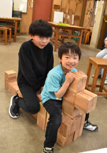 ▼木のパズル(大)で犬のようなものを作ったのかな?組み合わせると立方体になるのですが、犬にするのもすごい!