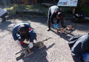 こちらのチームは、薪作りです。以前伐採した材を細かく切り、子どもたちがたき火で使う用の小さな薪を作っていただきました。