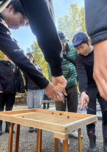 まずは、アイスブレークを兼ねて「第1回 ドングリゴマ王座決定選!しがぎんカップin河辺いきものの森」を行いました。ドングリゴマは簡単に作れるおもちゃですが、軸をぶらさずよく回すためには、ベストなドングリ選びやど真ん中に爪楊枝を差し込むなど、知恵と工夫が必要です!4チームに分かれて勝ち抜き選手権を行いました。勝者は誰⁉と、どのチームも盛り上がっていました☆