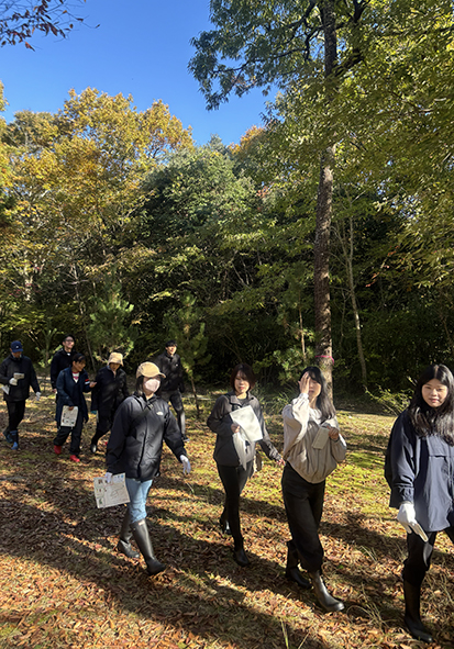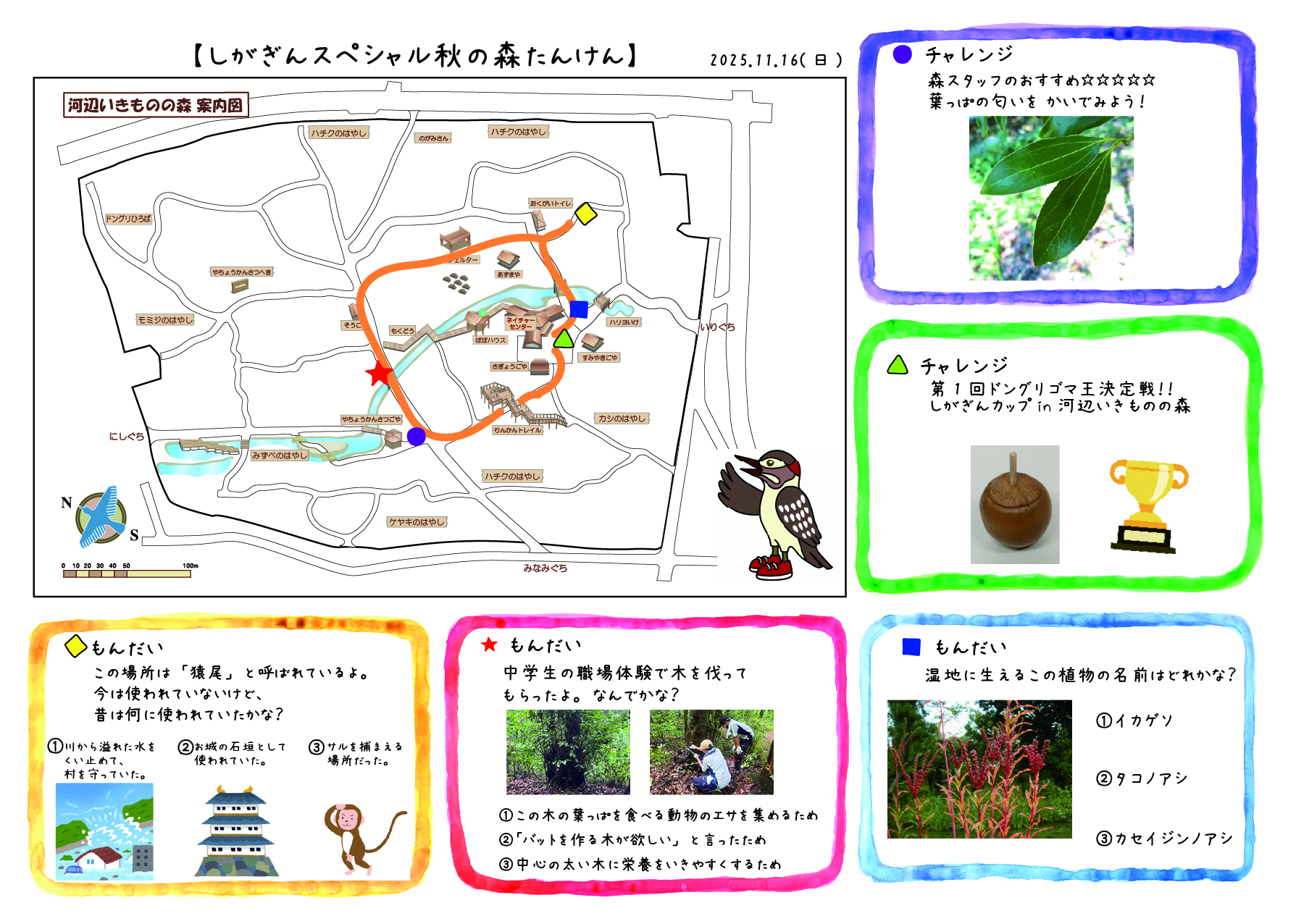 また、作業だけでなく、どんな森なのかを従業員にも知って欲しいとのご要望をいただき、森のガイドもさせていただきました。私たちは保全活動と並行して子どもたちの環境学習の委託事業を東近江市から受けています。今日は普段、子どもたち向けに作成している「森のたんけんカード」を滋賀銀行様バージョンで作成し、秋の森たんけんをお楽しみいただきました♪