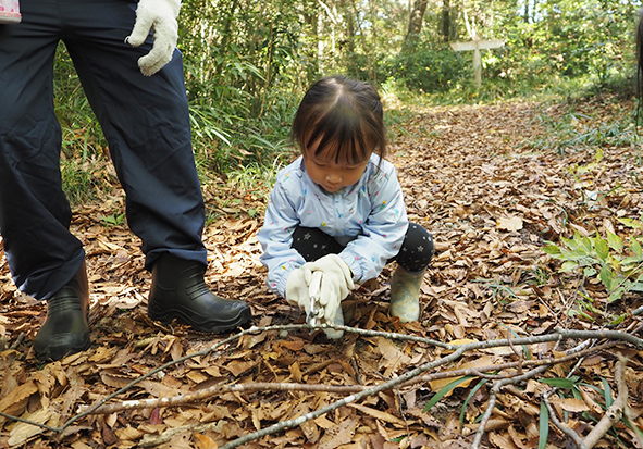 こちらは、林内整備①(ウラゲエンコウカエデの下草処理)です。草の実の多い林床なので、光が当たるようにするため、大きくなると日陰を作ってしまう常緑樹を中心に伐っていただきました。小さな子どもたちも頑張ってくれ、あたたかな雰囲気に包まれていました。