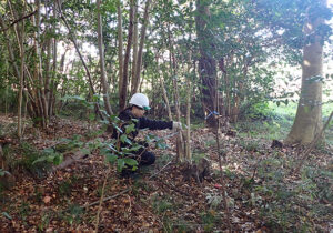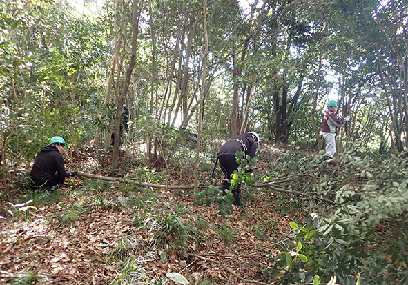 こちらのチームは、林内整備②(ケヤキの林付近)です。常緑樹が増えすぎて風通しが悪く、日当たりも悪いので、樹種をみながら伐採をしていただきました。作業をしていると汗が出てくるほどでしたね。作業終了後、森が明るくなった、風通しが良くなったことを感じてくださっていました。