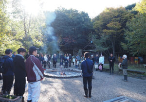 「ドングリゴマ王座決定選!しがぎんカップ」の後は、4チームに分かれて森たんけんに出発しました。道中でクイズをしたり、スタッフおすすめの葉っぱの匂いをかいでみたり、小学生の時にやまのこ学習で来訪しましたという方もおられました。「久しぶりに森に来れるのをとても楽しみにしていました」と言ってくださり、私たちもとても嬉しい気持ちになりました。
