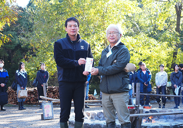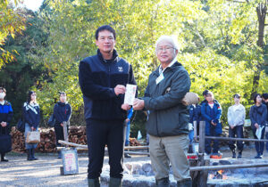 朝雛支店長様のご挨拶、遊林会井田代表の挨拶の後、ご寄付の贈呈式がありました。いただいたご寄付は森の活動のために大切に活用させていただきます!お心遣いありがとうございました。
