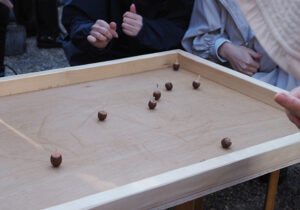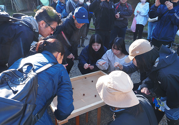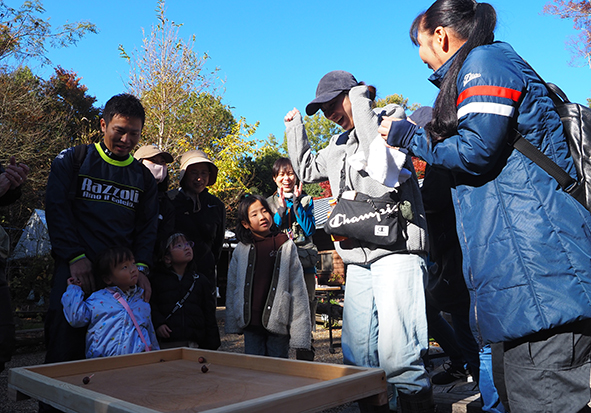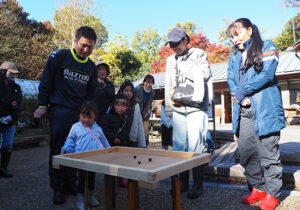 まずは、アイスブレークを兼ねて「第1回 ドングリゴマ王座決定選!しがぎんカップin河辺いきものの森」を行いました。ドングリゴマは簡単に作れるおもちゃですが、軸をぶらさずよく回すためには、ベストなドングリ選びやど真ん中に爪楊枝を差し込むなど、知恵と工夫が必要です!4チームに分かれて勝ち抜き選手権を行いました。勝者は誰⁉と、どのチームも盛り上がっていました☆