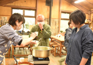 ▼よもぎのゴミを取り、綺麗に洗った後は沸騰したお湯で3~4分煮ます。熱湯によもぎを入れてすぐの煮汁を、フレッシュハーブティーで飲んでみました。すっとする爽やかな味。「なんだかお寺みたいな味…」「あ~、分かる!」と言うユニークな感想もあり、楽しいひと時でした。